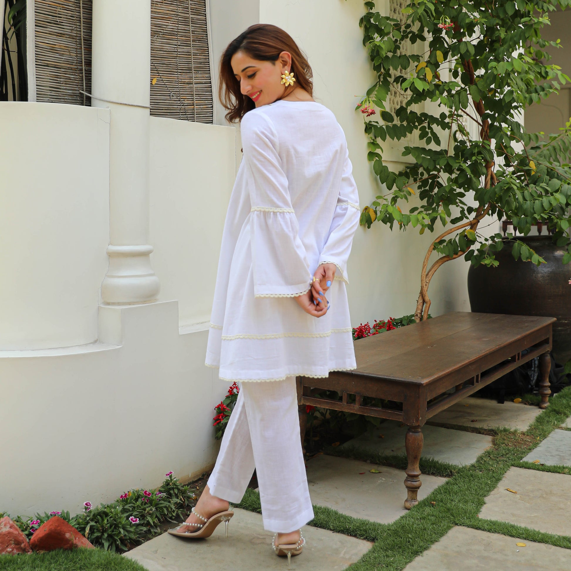 Introducing our Cotton Charm Co-ord Set in timeless white, featuring whimsical bell sleeves that will have you feeling like the ultimate style enchantress! Prepare to be captivated by this delightful ensemble, crafted from the softest cotton to embrace your skin with a gentle caress. The pristine white hue exudes elegance and versatility, making it the perfect canvas for your fashion adventures.