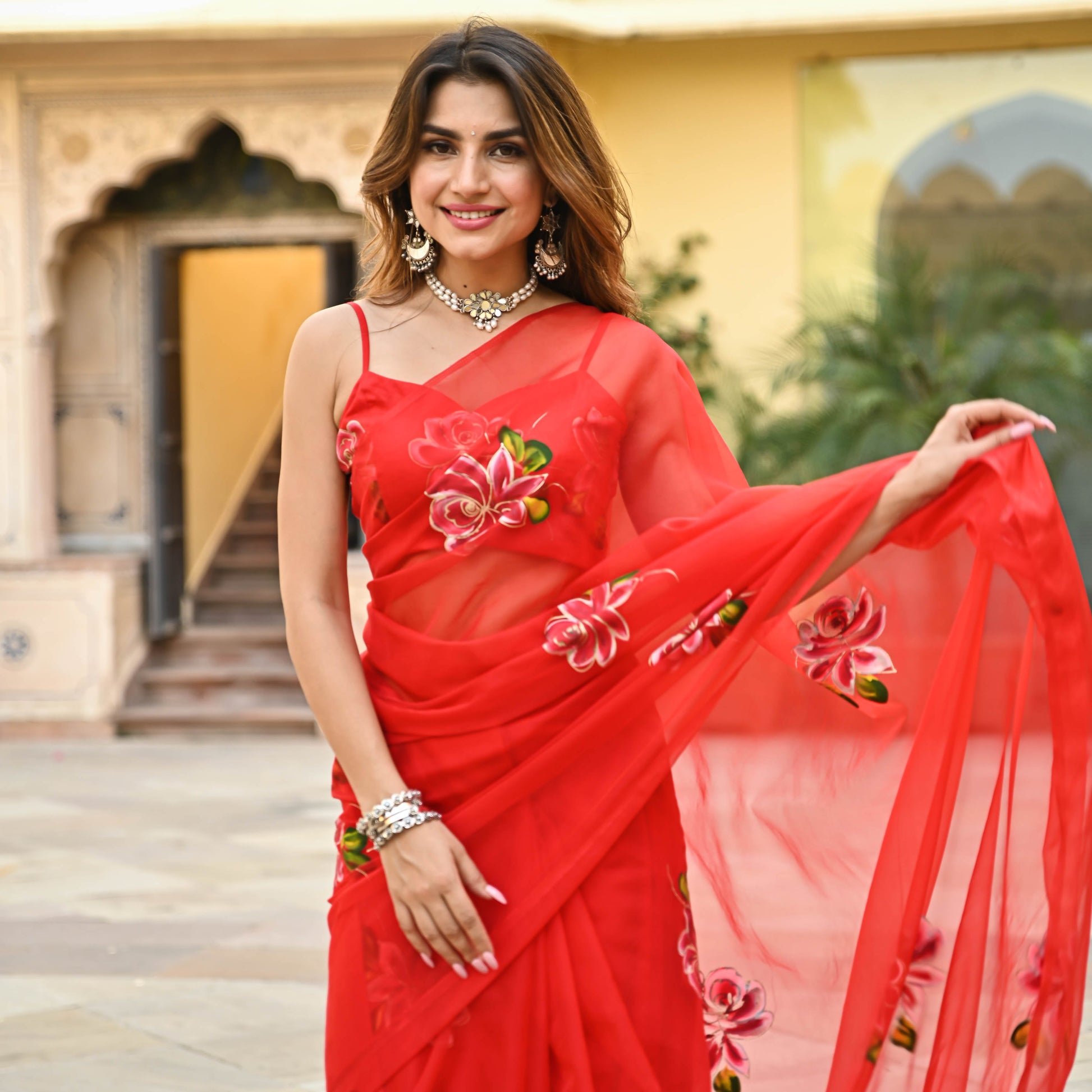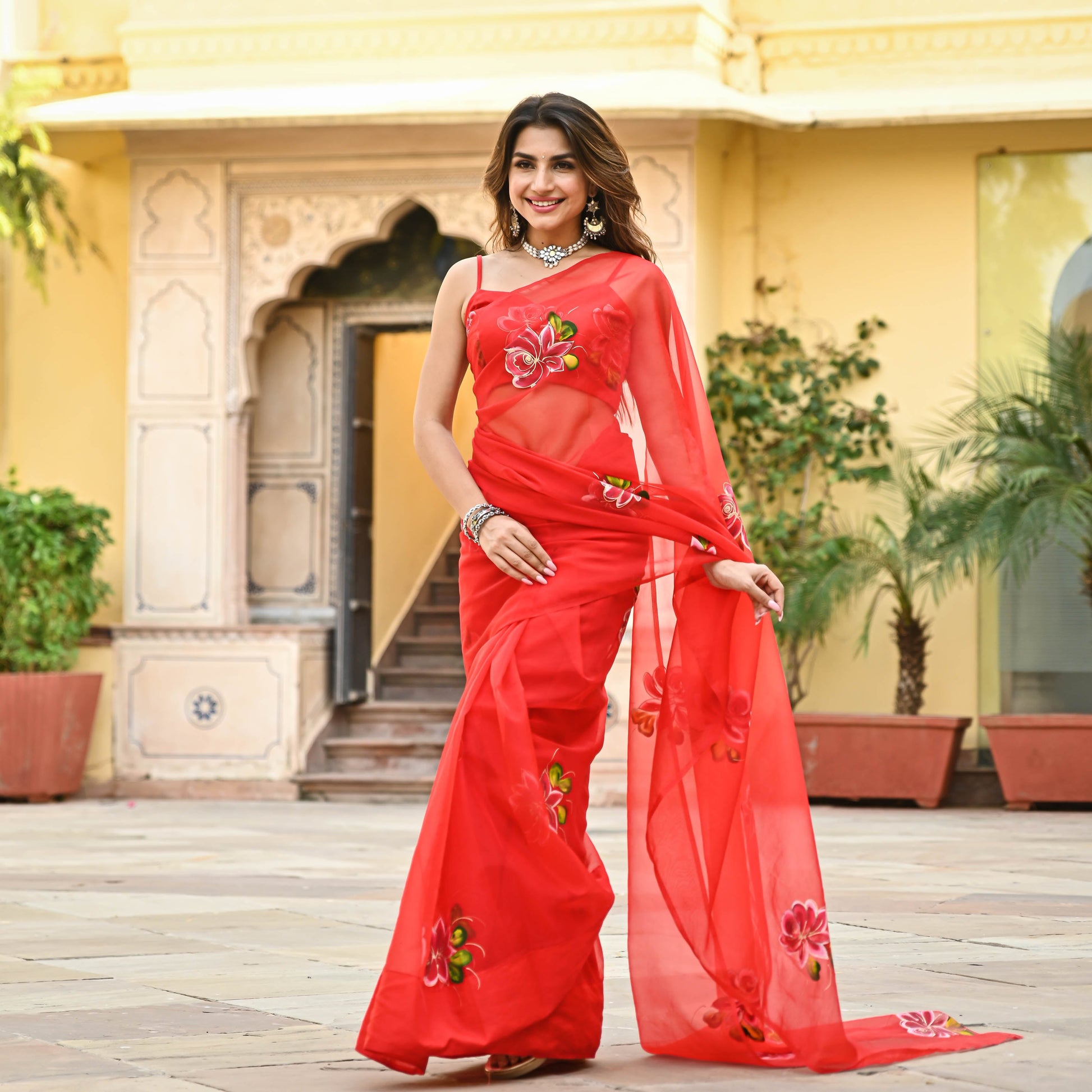 Red is never out of style! This beautiful sari features a handpainted floral design on sheer red fabric. Pair it with some pearls and a sleeveless blouse and you're good to go!
