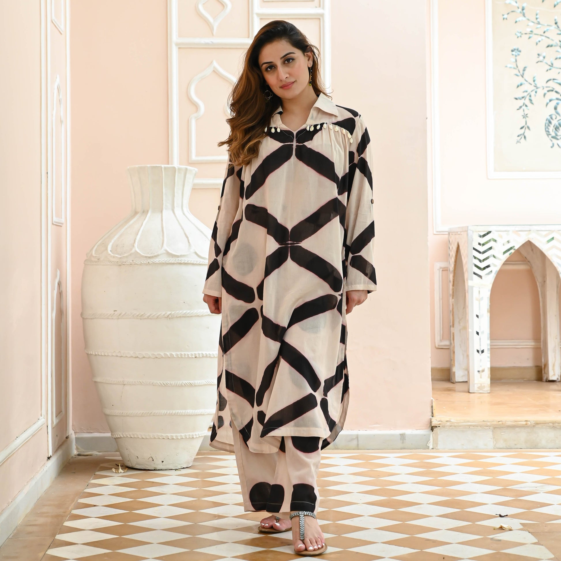 Elevate your fashion game with the Triptika Clamp Co-ord Set, a delightful fusion of comfort and intricate detailing. Crafted from pristine white cotton fabric, this ensemble offers a breathable, comfortable fit perfect for any occasion. Adorned with delicate sea-shell details and a captivating brown geometric print, it adds a touch of serene charm.